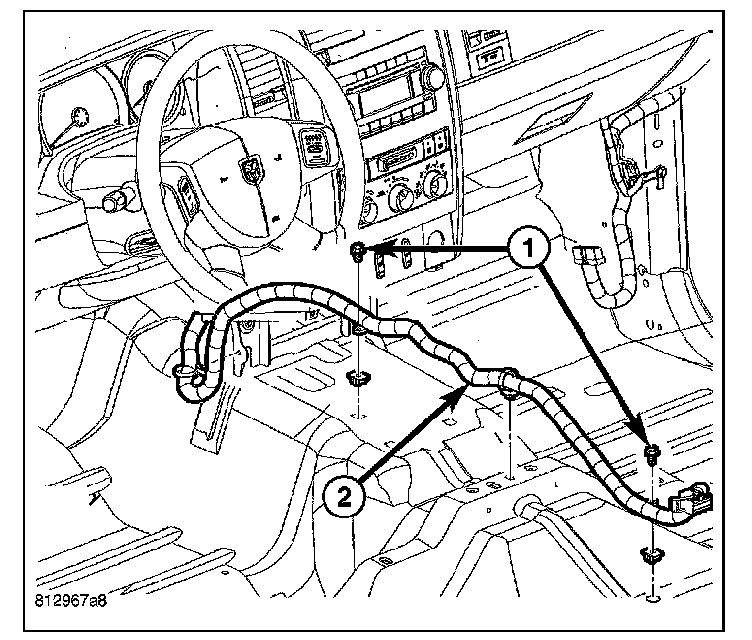28. Position the carpet aside and remove the center harness screws (1). Pull instrument panel wiring harness (2) from under the carpet.
