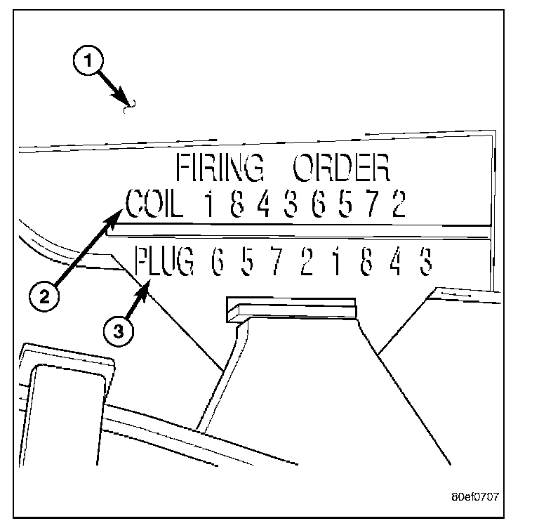 Eight conventional spark plug cables are used with the 5.7L. These cables connect a coil on one cylinder bank, directly to a spark plug on the opposite cylinder bank. The cables are placed and routed in special plastic looms to keep them separated. These plastic looms are clipped to the intake manifold. To prevent a mismatch of cables, a corresponding spark plug / coil number is displayed on each plug cable: 1/6, 2/3, 4/7 and 5/8. These numbers (2) and (3) can also be found on the top of the intake manifold.
