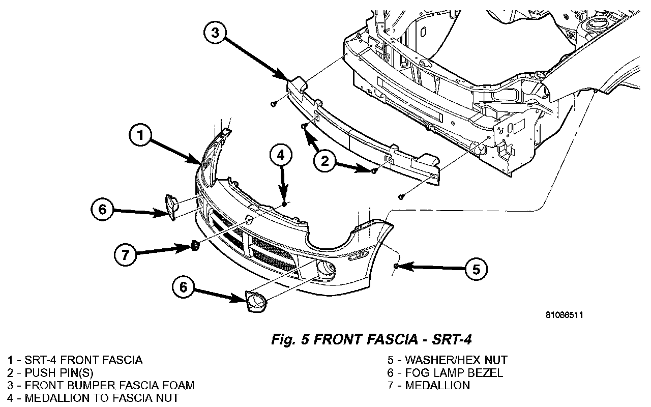 1. SRT-4 vehicle place into position the fascia to crossmember upper blockers to the fascia (Fig. 5).