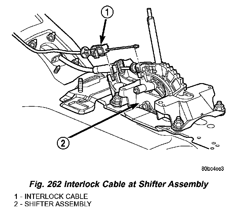 5. Disconnect the shifter/ignition interlock cable from the shifter lever and bracket as shown in (Fig. 262). Remove the cable core end from the plastic cam of the shifter mechanism and release cable from shifter bracket