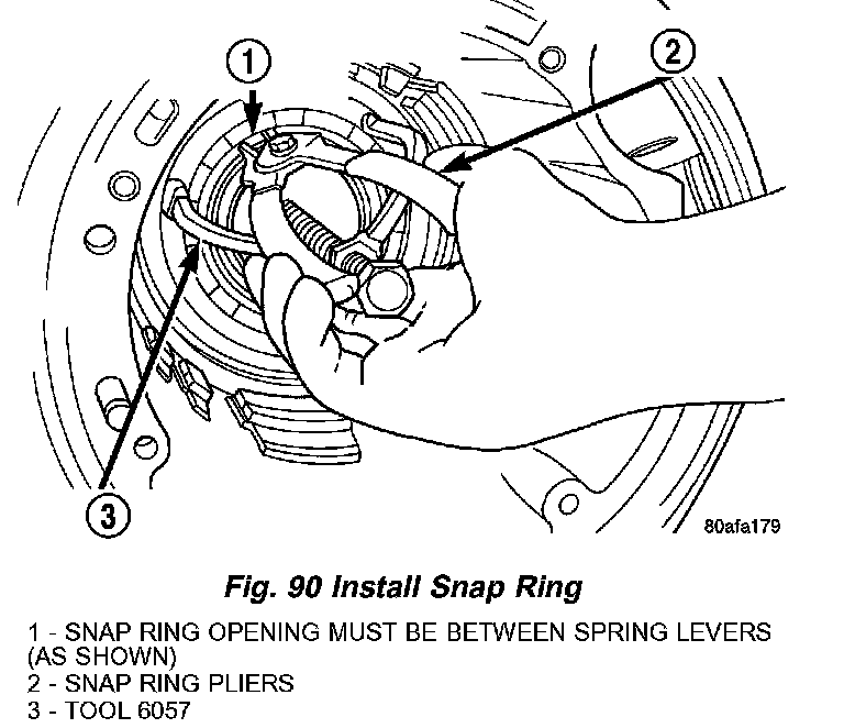 10. Install low/reverse spring compressor into position (Fig. 89). Compress low/reverse piston and install snap ring as shown in (Fig. 90).
