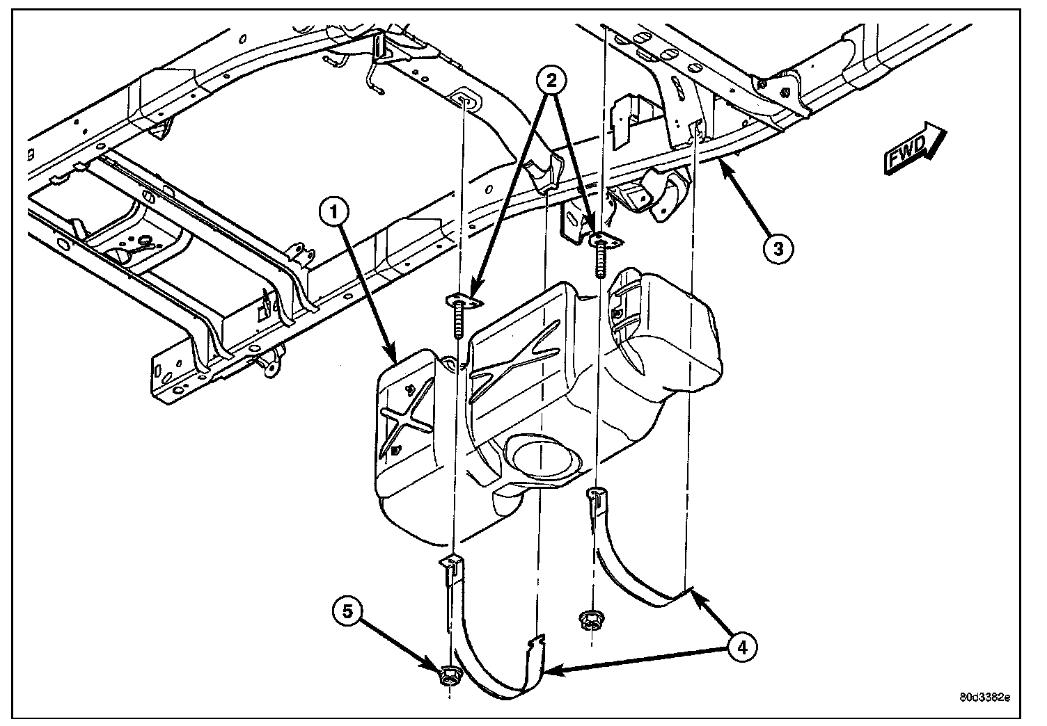 2. Remove 2 fuel tank strap nuts (5) and remove both tank support straps.