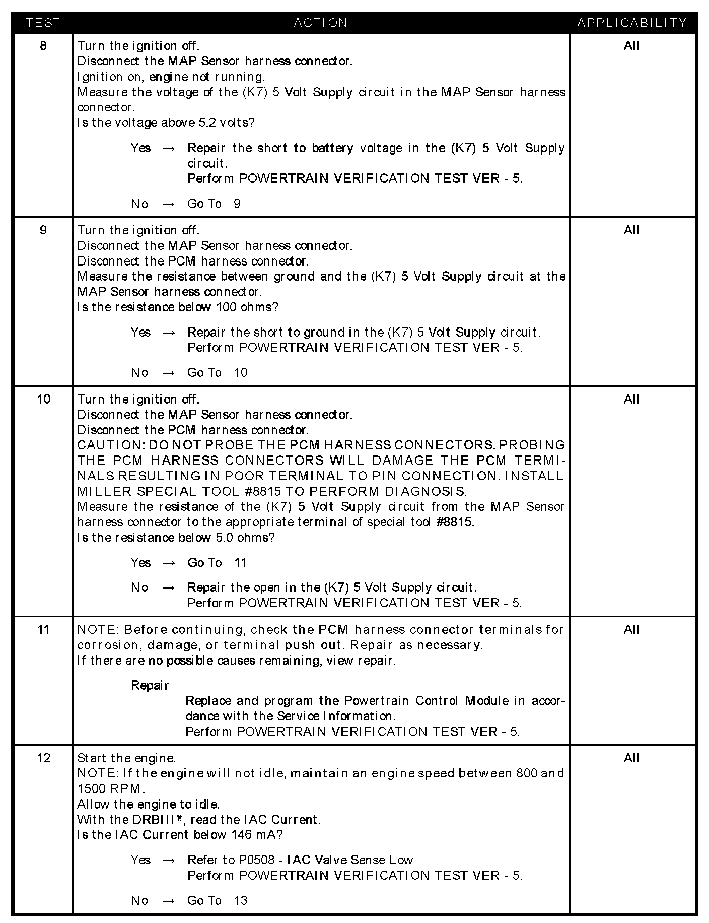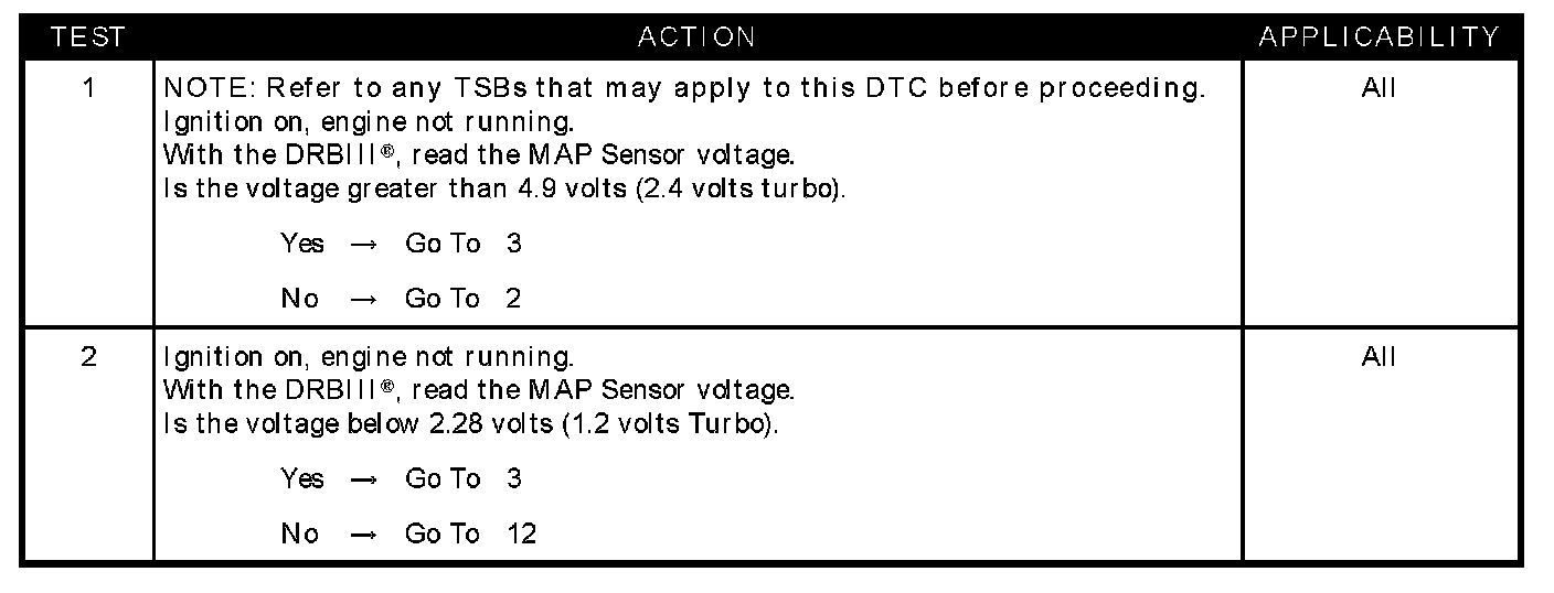 The PCM senses the voltage from the MAP sensor to be greater than 4.9L volts (2.4 volts Turbo) but below 2.28 volts (1.2 Turbo) of a volt for 300 milliseconds. One Trip Fault.