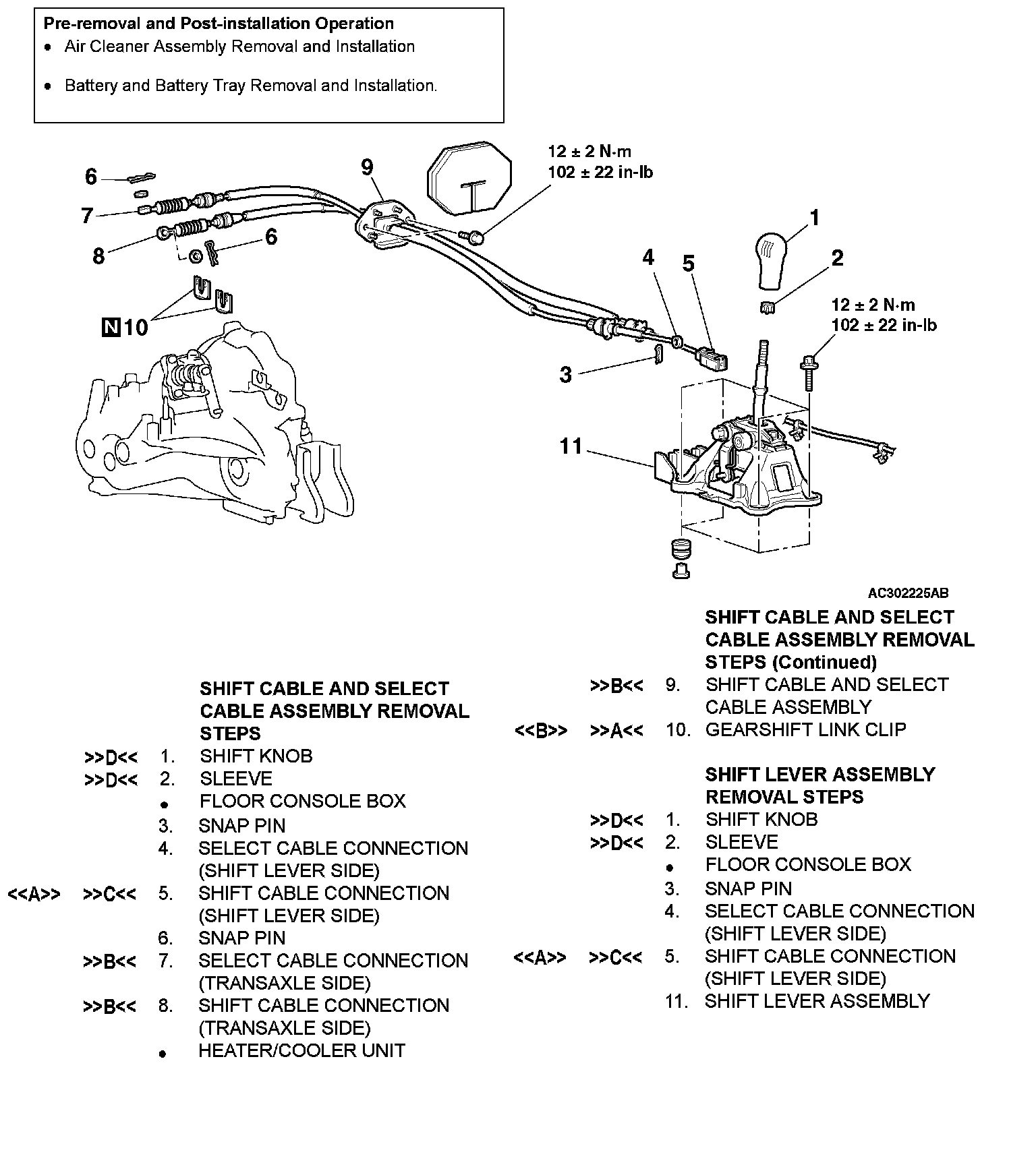 WARNING: Be careful not to subject the SRS-ECU to any shocks during removal and installation of the shift cable and select cable assembly.