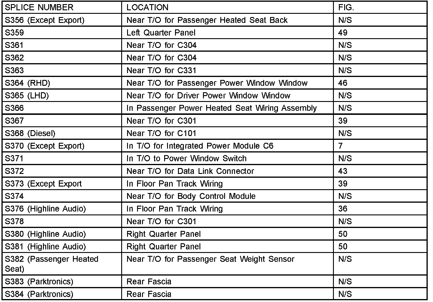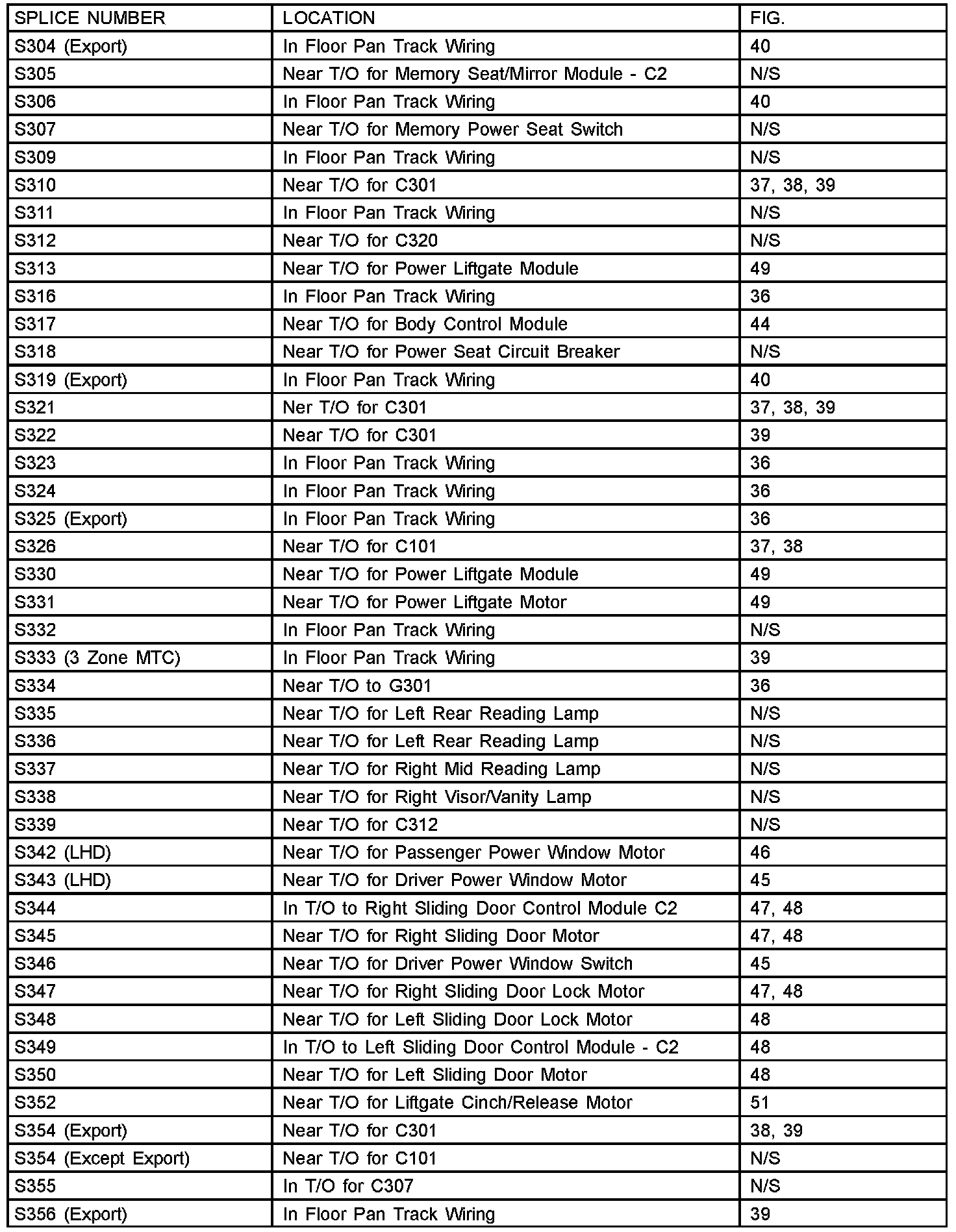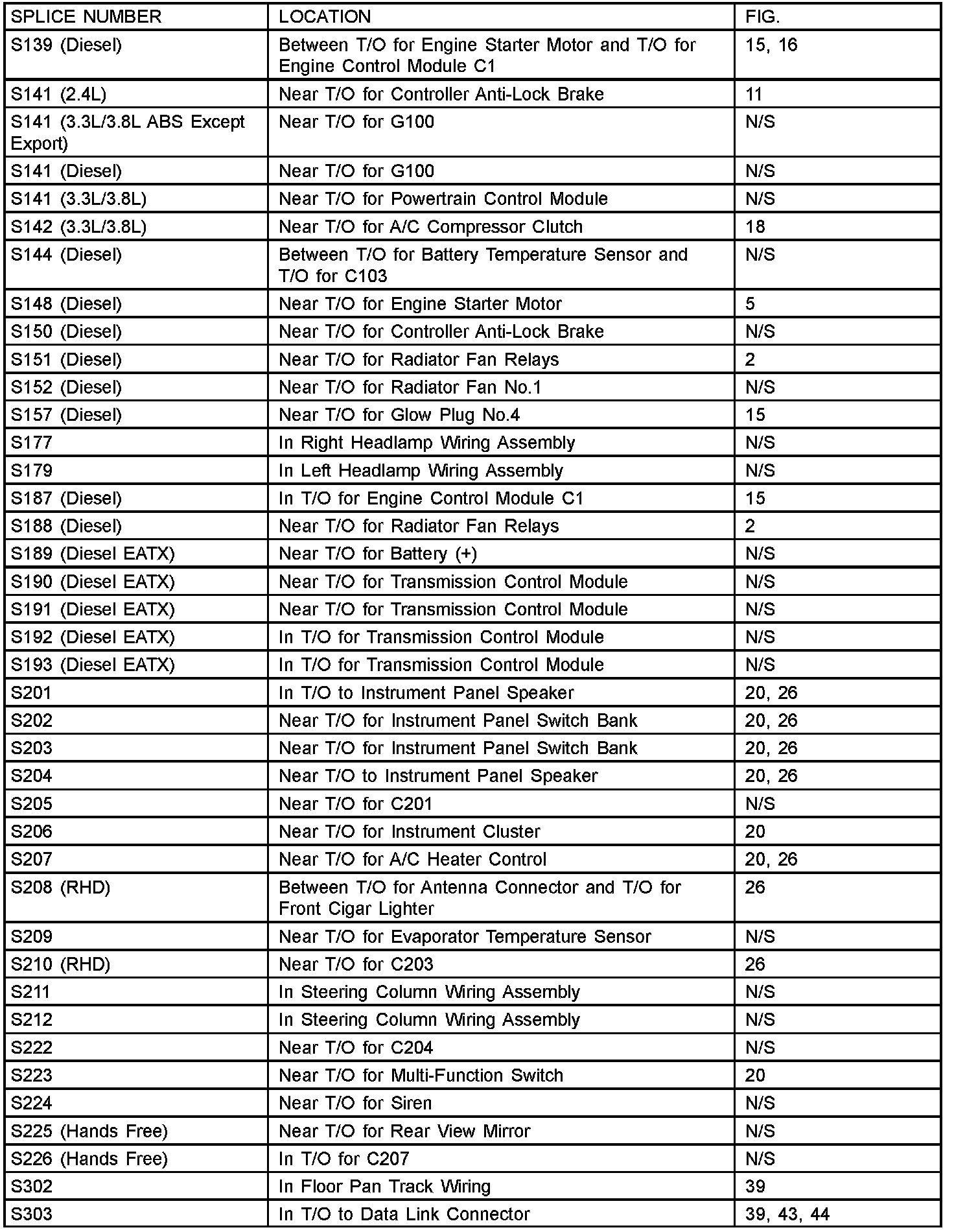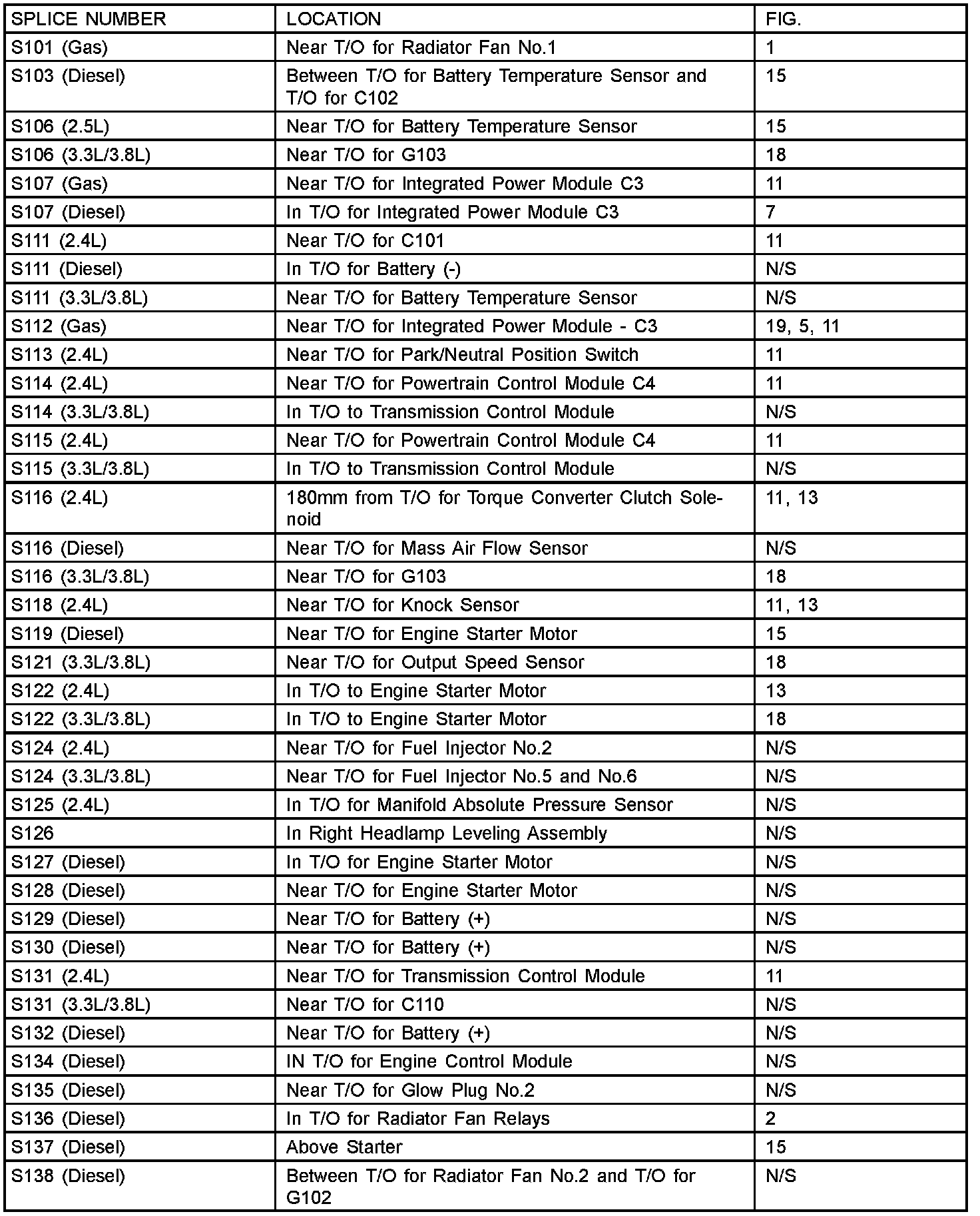 The abbreviation T/O (Take Out) is used in the location column to indicate a point in which the wiring harness branches out to a component.