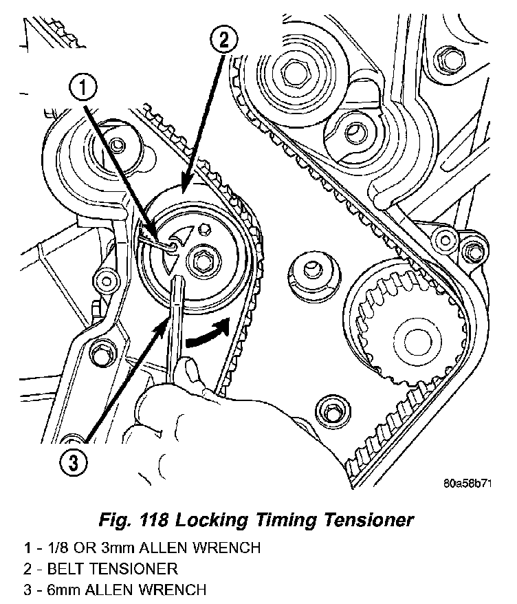 15. Install 6 mm Allen wrench into belt tensioner. Before rotating the tensioner, insert the long end of a 1/8" or 3 mm Allen wrench into the pin hole on the front of the tensioner (Fig. 118). While rotating the tensioner counterclockwise, push in lightly on the 1/8" or 3 mm Allen wrench, until it slides into the locking hole.