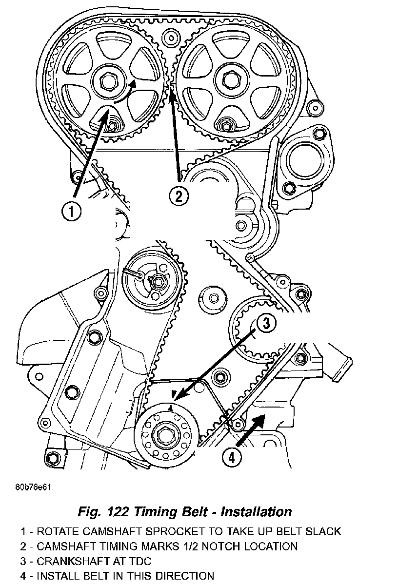 6. Once the timing belt has been installed and tensioner released, rotate the crankshaft two (2) complete revolutions. Verify that the TDC marks on crankshaft and timing marks on the camshafts are aligned as shown in (Fig. 123).