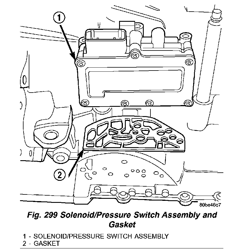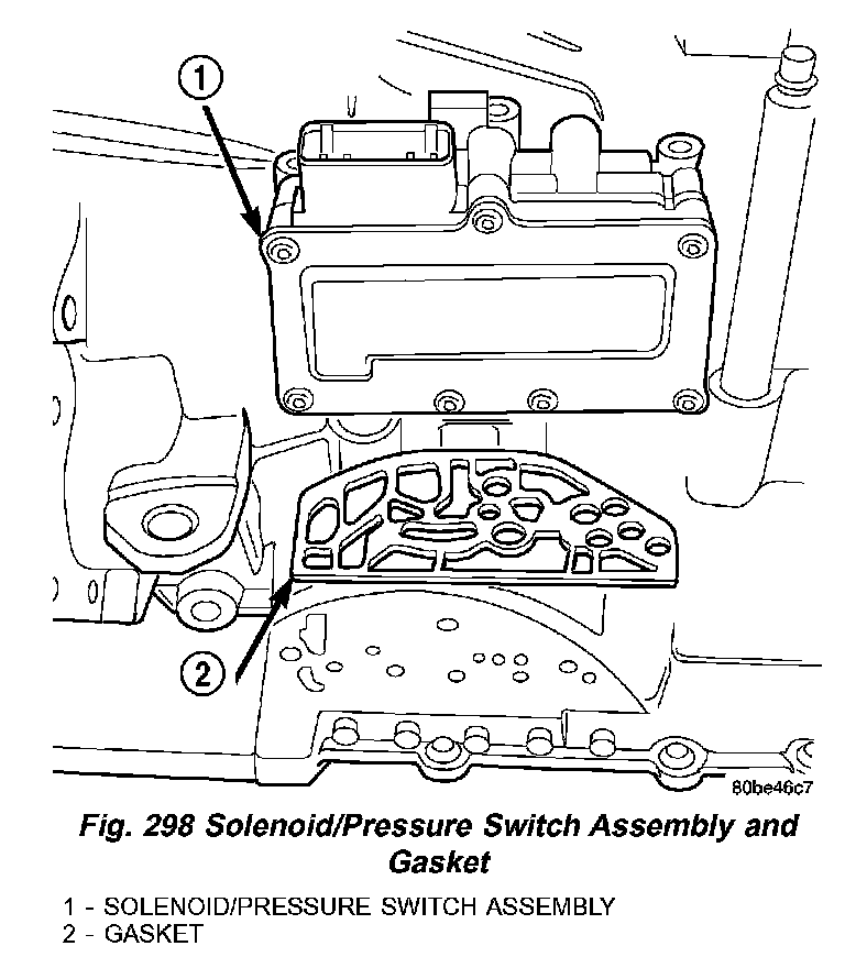 7) Remove solenoid/pressure switch assembly (1) (Fig. 298) and gasket (2). Use care to prevent gasket material and foreign objects from become lodged in the transaxle case ports.
