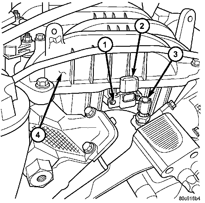 ENGINE COOLANT TEMPERATURE SENSORThe Engine Coolant Temperature (ECT) sensor (3) on the 3.7L engine is installed into a water jacket at front of intake manifold near rear of generator.