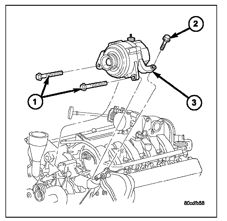 1. Position generator (3) to engine and install 2 horizontal bolts (1) and 1 vertical bolt (2).