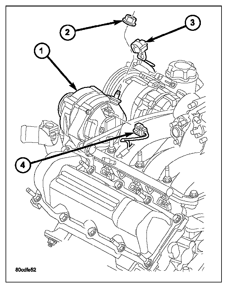 5. Disconnect field wire connector (4) at rear of generator by pushing on connector tab.