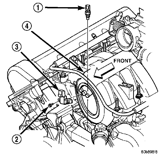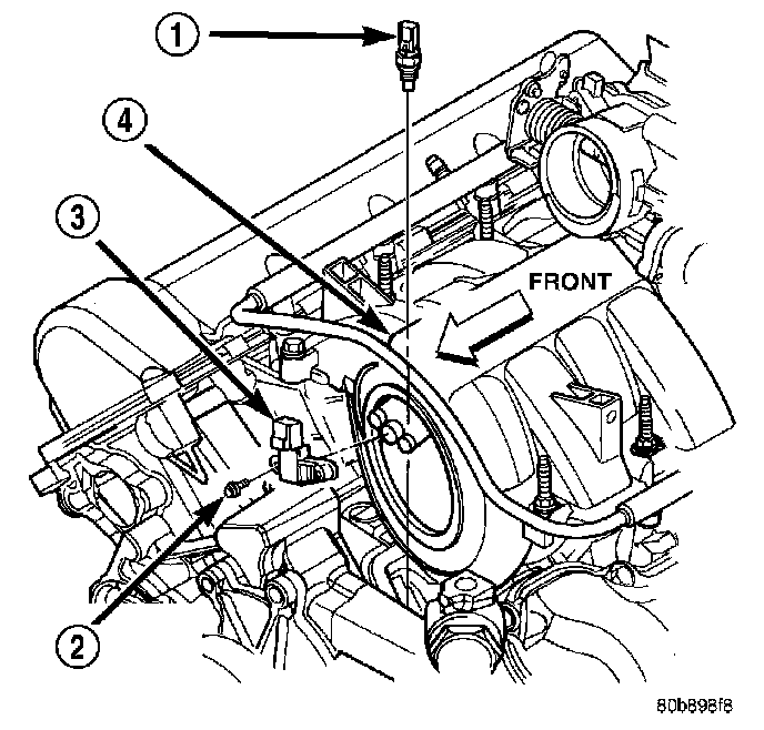 ENGINE COOLANT TEMPERATURE SENSORThe Engine Coolant Temperature (ECT) sensor (1) on the 4.7L V-8 engine is located near the front of the intake manifold.