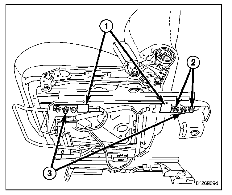 7. Move the seat to the reward position on the tracks and install the front seat adjuster bolts/nuts (3).