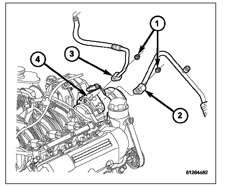5. Remove the nuts (1) that secure the A/C suction line (2) and A/C discharge line (3) to the A/C compressor (4).