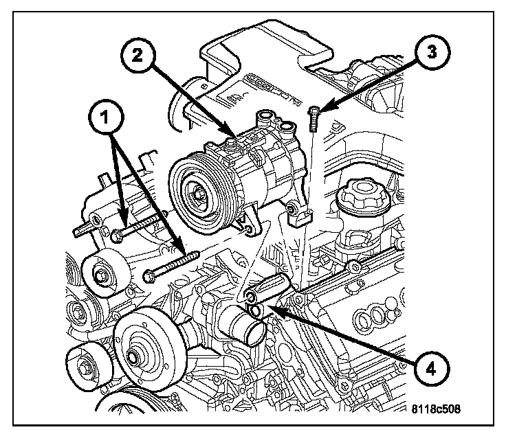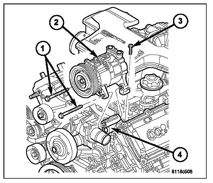 11. Remove the bolts (1 and 3) that secure the A/C compressor (2) to the mounting bracket (4).