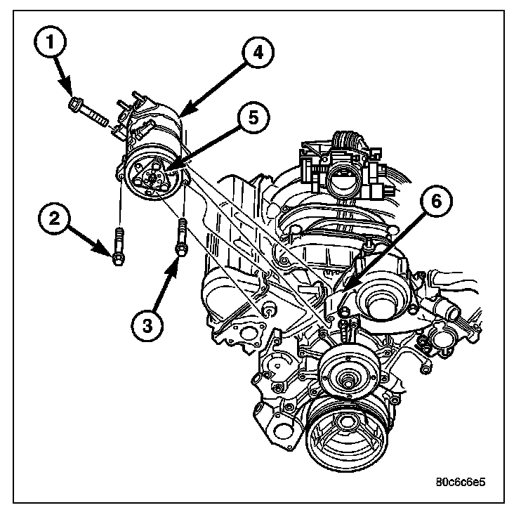 8. If equipped with the 3.7L or 4.7L engine, remove the bolts (1, 2 and 3) that secure the A/C compressor (4) to the mounting bracket (6).