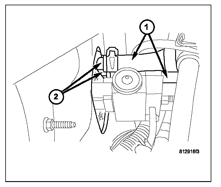12. Raise the vehicle and install the heater hoses (1) to the heater core tubes (2) in the engine compartment