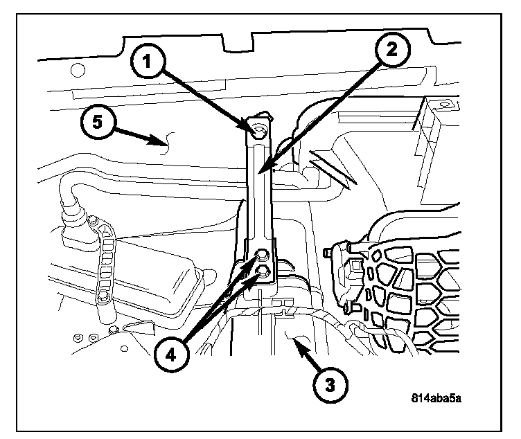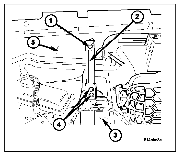6. Remove the bolt (1) that secures the HVAC housing bracket (2) to the dash panel (5).