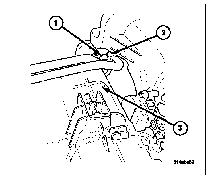 6. Install the heater core tube retaining bracket (2) to the top of the HVAC housing (3).
