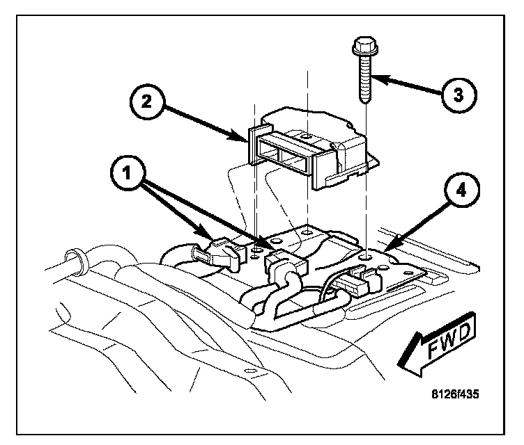 4. Remove the three screws (3) that secure the ORC to the ORC bracket (4) that is welded onto the top of the floor panel transmission tunnel.
