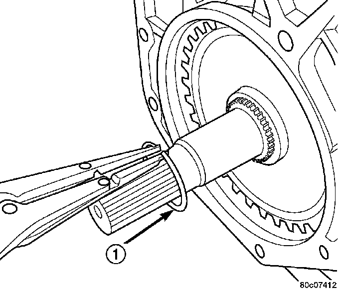 37. Remove the snap-ring (1) holding the park sprag gear onto the output shaft.