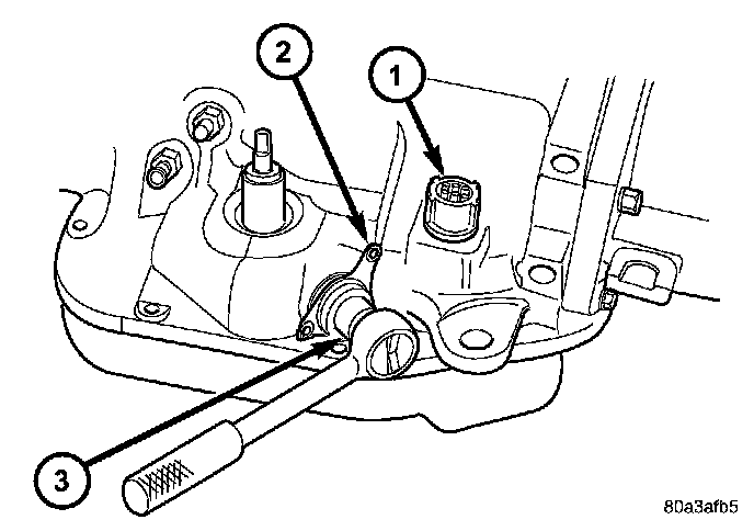 2. If necessary, install the TRS mounting bracket (2) into the transmission case. Using Adapter 8581 (3), tighten the mounting bracket to 34 Nm (300 inch lbs.).