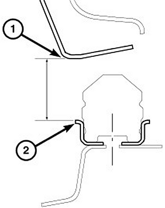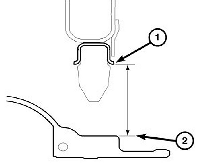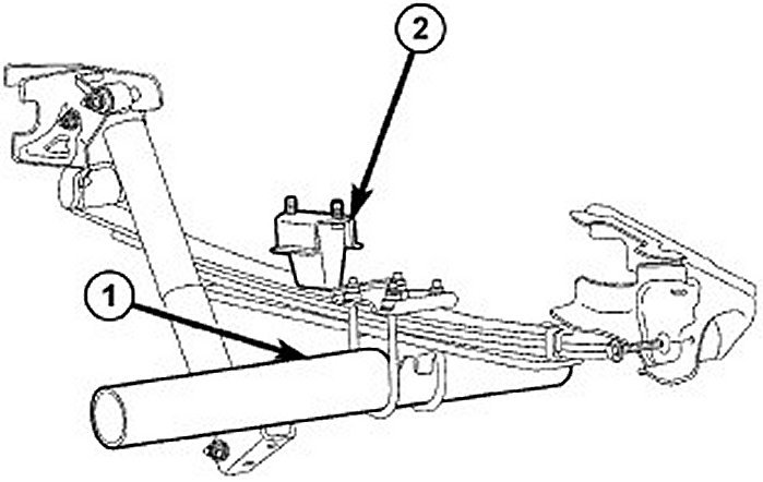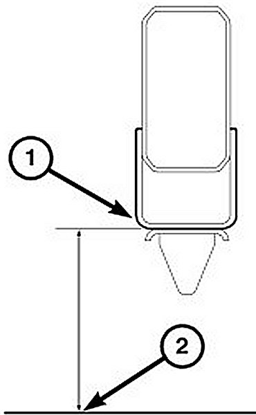 1. Front 4X2 On each side of the vehicle, measure the distance from the top of the jounce bumper flange (2) to the bottom of the frame rail (1).