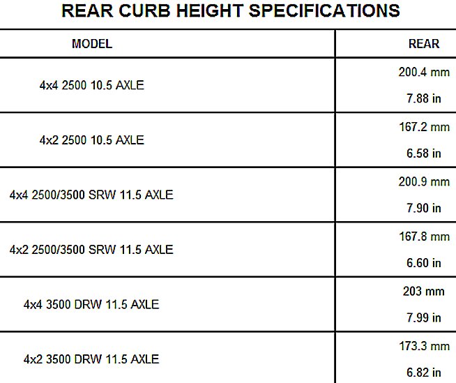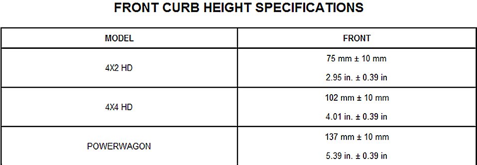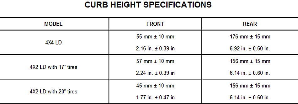 5. Compare the measurements to the specifications listed in the following Curb Height Specifications chart.