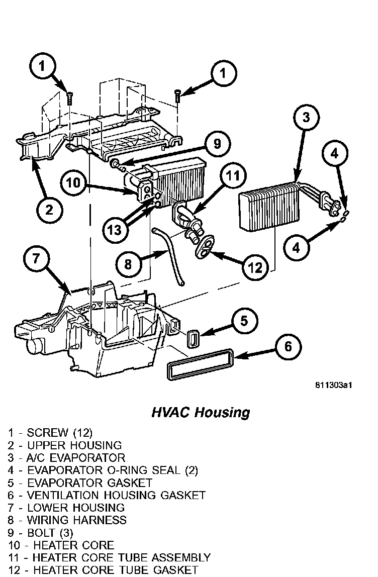 3. Remove the gasket located at the A/C evaporator and heater core tubes and the gasket that seals the ventilation housing to the HVAC housing.