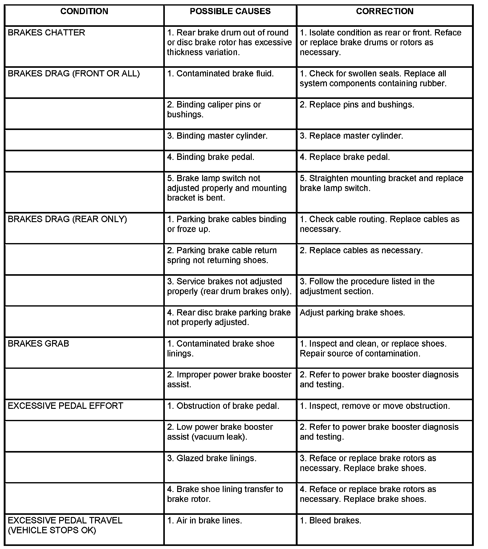 NOTE: There are three diagnosis charts following that cover the RED BRAKE WARNING INDICATOR LAMP, BRAKE NOISE and OTHER BRAKE CONDITIONS.