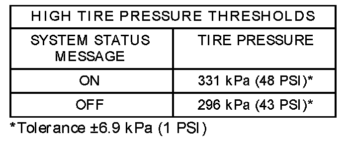 An active fault will be triggered when a system failure has been detected. When this occurs, the Instrument Cluster will illuminate the TPMS indicator and the SKREEM will store the fault code. An alert will be triggered when a tire pressure has gone below or above the set threshold pressure. When this occurs, the Instrument Cluster will flash the TPMS indicator. The SKREEM will request a secondary message to be displayed on the EVIC (if equipped). Only when a tire pressure has gone below the set threshold pressure will the SKREEM request the TPMS indicator to flash and display the EVIC message (if equipped). When a high pressure alert occurs, only the EVIC message will be displayed. This action will be displayed as long as the alert condition is active.