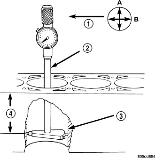 2. Measure the inside diameter of the cylinder bore (3) at a point 38.0 mm (1.5 inches) below top of bore. Start perpendicular (across or at 90 degrees) to the axis of the crankshaft at point A and then take an additional bore reading 90 degrees to that at point B.