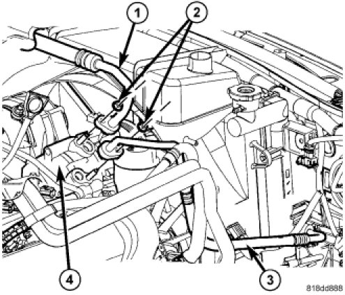 9. Connect the A/C suction line (1) and the A/C discharge line (3) to the A/C compressor (4).