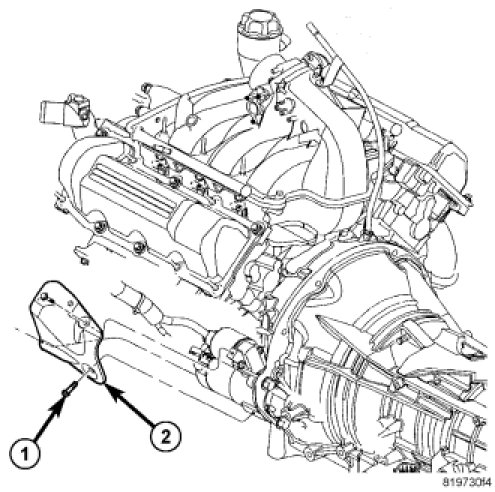 5. Position starter heat shield (2) and install two bolts (1).