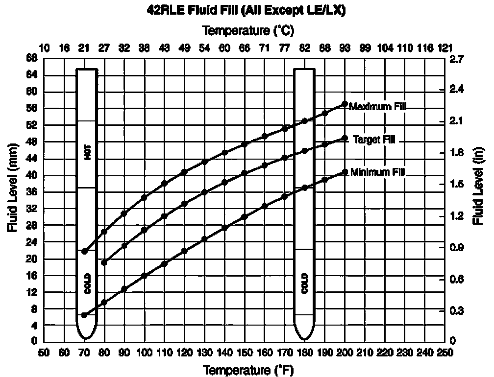 The torque converter fills in both the Park and Neutral positions. Place the selector lever in Park to be sure that the fluid level check is accurate. The engine should be running at idle speed for at least one minute, with the vehicle on level ground. At normal operating temperature, (approximately 82° C or 180° F), the fluid level is correct if it is in the HOT region (cross-hatched area) on the oil level indicator. The fluid level should be in COLD region at 21° C (70° F) fluid temperature. Adjust the fluid level as necessary. Use only Mopar ATF+4, automatic transmission fluid.