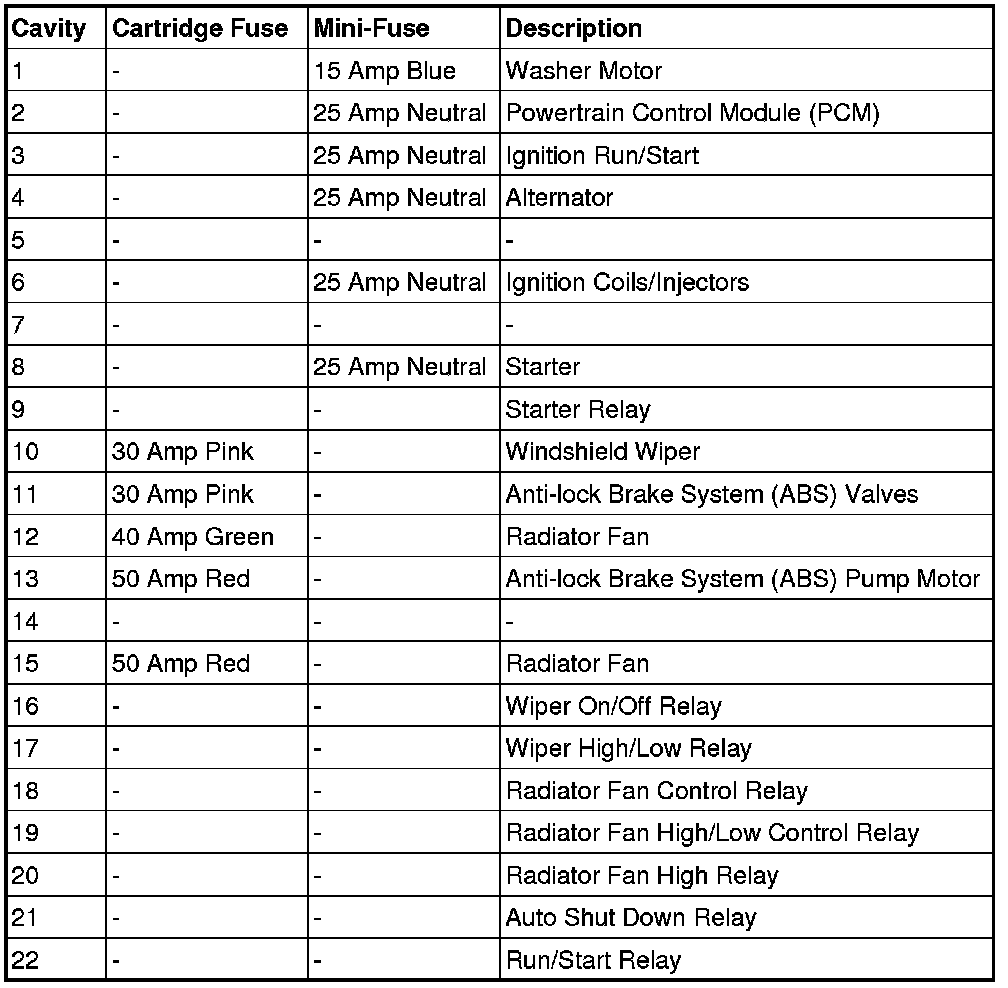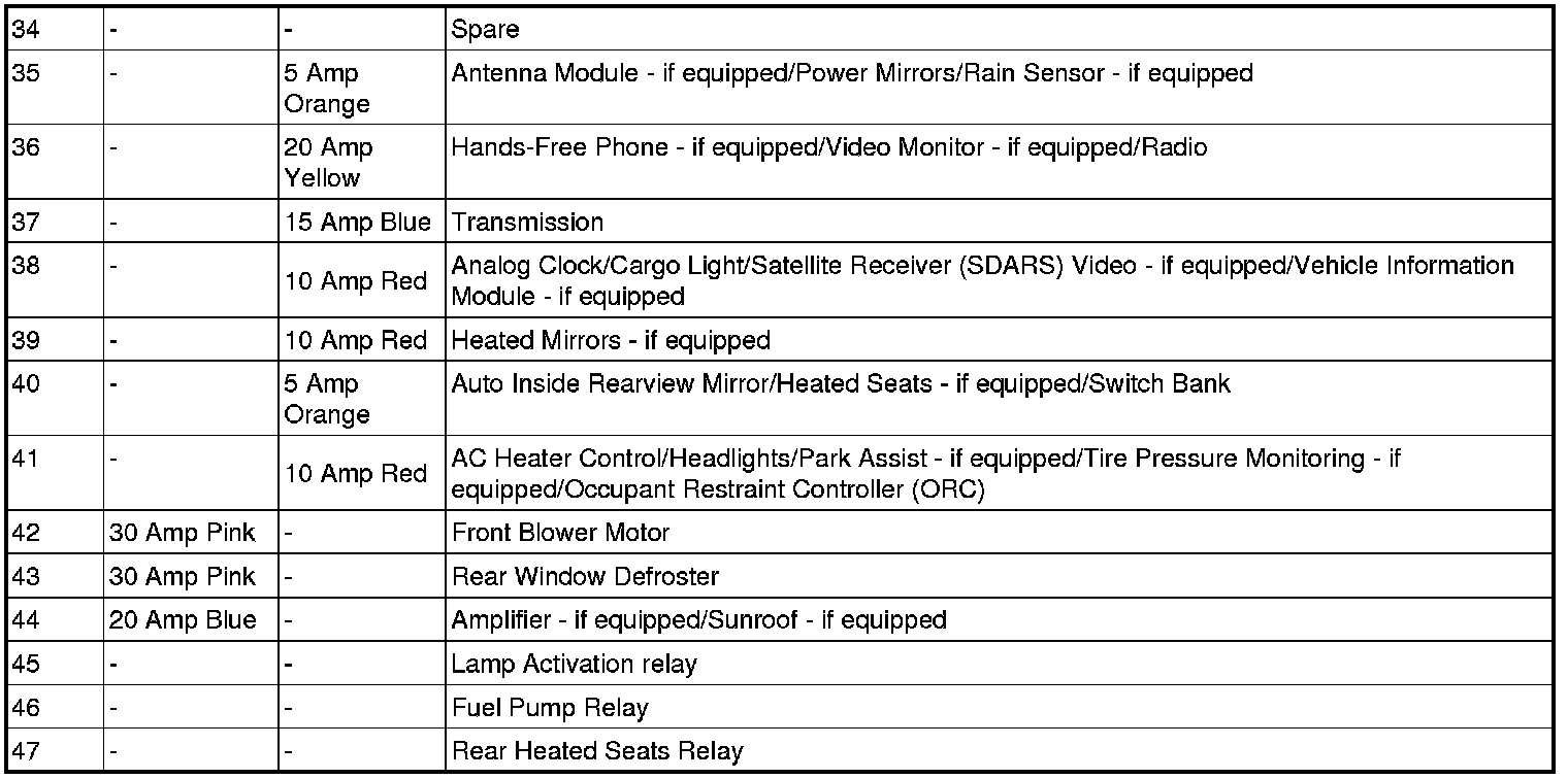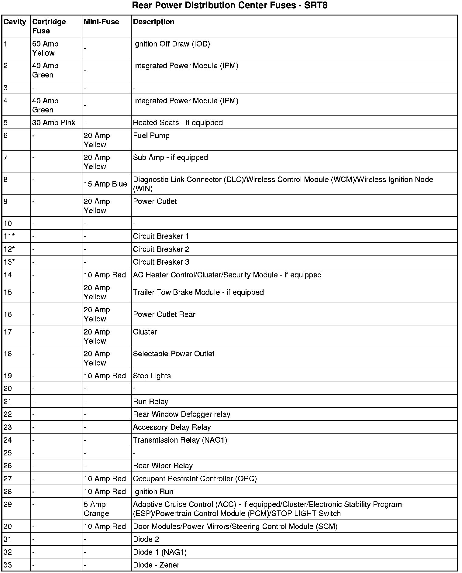 * Cavities 11, 12, and 13 contain self-resetting fuses (circuit breakers) that are only serviceable by an authorized dealer. The Cluster (without power memory seat), the Driver Seat Switch (with power memory seat), and the Memory Module (if equipped) are fused by the 25 amp circuit breaker in Cavity 11. The Passenger Seat Switch is fused by the 25 amp circuit breaker in Cavity 12. The Door Modules (except base), the Driver Door Lock Switch (base), the Driver Express Power Window Switch (if equipped), and the Passenger Door Lock Switch (base) are fused by the 25 amp circuit breaker in Cavity 13. If you experience temporary or permanent loss of these systems, see your authorized dealer for service.