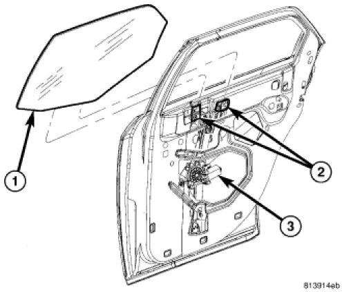 5. Using the regulator, adjust the rear door glass (1) position up or down as required for access to the two window regulator glass clamps (2).