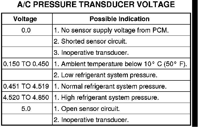 The A/C pressure transducer is diagnosed using a scan tool. Before testing the A/C pressure transducer, be certain that the transducer wire harness connection is clean of corrosion and properly connected. For the A/C to operate, an A/C pressure transducer voltage reading between 0.451 and 4.519 volts is required. Voltages outside this range indicate a low or high refrigerant system pressure condition to the powertrain control module (PCM). The PCM is programmed to respond to a low or high refrigerant system pressure by suppressing operation of the A/C compressor. Refer to the A/C Pressure Transducer Voltage chart (below) for the possible conditions indicated by the transducer voltage reading.