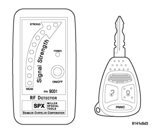 Using special tool 9001, first test to ensure that the transmitter is functioning. Typical testing distance is 2.5 centimeters (1 inch) for Asian transmitters and 30.5 centimeters (12 inches) for all others. To test, position the transmitter as shown. Press any transmitter button, then test each button individually. The tool will beep if a radio signal strength that lights five or more LED's is detected. Repeat this test three times. If transmitter fails any of the test refer to the proper Diagnostic Procedures information.