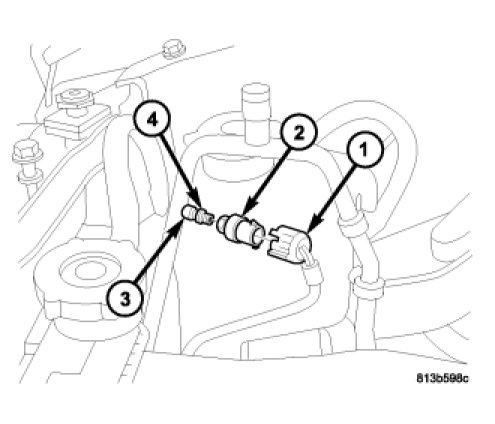 2. Install the A/C pressure transducer (2) onto the A/C liquid line. Tighten the A/C pressure transducer securely.