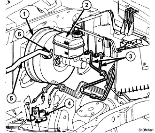 The fluid fill level is indicated on the side of the master cylinder reservoir (2).