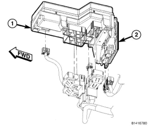 The Front Control Module (FCM) (2) is a micro controller based module located in the left front corner of the engine compartment. The FCM mates to the Power Distribution Center (PDC) (1) to form the Integrated Power Module (IPM). The IPM connects directly to the battery and provides the primary means of circuit protection and power distribution for all vehicle electrical systems. The front control module controls power to some of these vehicle systems electrical and electromechanical loads based on inputs received from hard wired switch inputs and data received on the Controller Area Network (CAN) bus circuit.