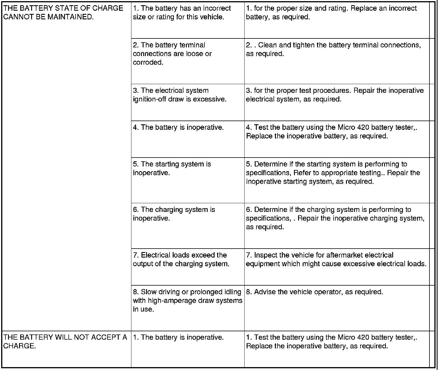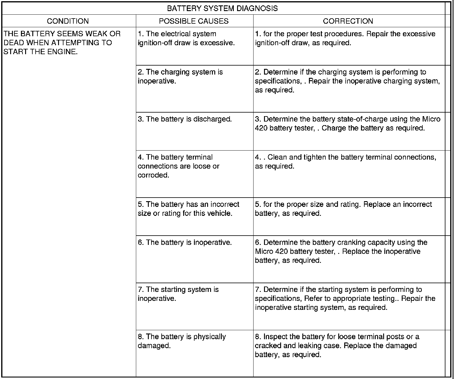 The battery, starting, and charging systems in the vehicle operate with one another and must be tested as a complete system. In order for the engine to start and the battery to maintain its charge properly, all of the components that are used in these systems must perform within specifications. It is important that the battery, starting, and charging systems be thoroughly tested and inspected any time a battery needs to be charged or replaced. The cause of abnormal battery discharge, overcharging or early battery failure must be diagnosed and corrected before a battery is replaced and before a vehicle is returned to service. The service data for these systems has been separated to make it easier to locate the specific information you are seeking. However, when attempting to diagnose any of these systems, it is important that you keep their interdependency in mind.