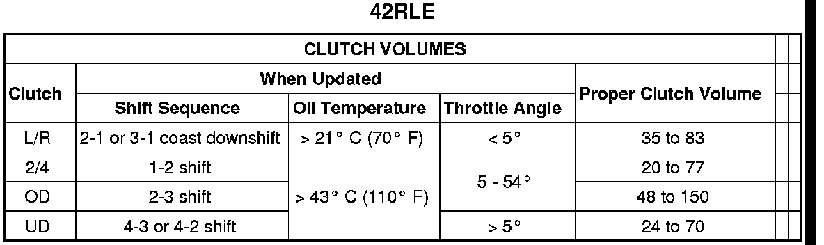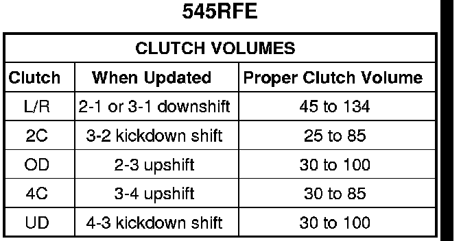 Certain mechanical problems within the input clutch assembly can cause inadequate or out-of-range element volumes. Also, defective Input/Output Speed Sensors and wiring can cause these conditions. The following charts identifies the appropriate clutch volumes and when they are monitored/updated: