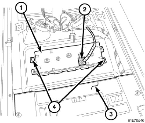 2. Install the two screws (4) that secure the rear A/C-heater control to the rear overhead console. Tighten the screws to 1.2 Nm (10 in. lbs.).