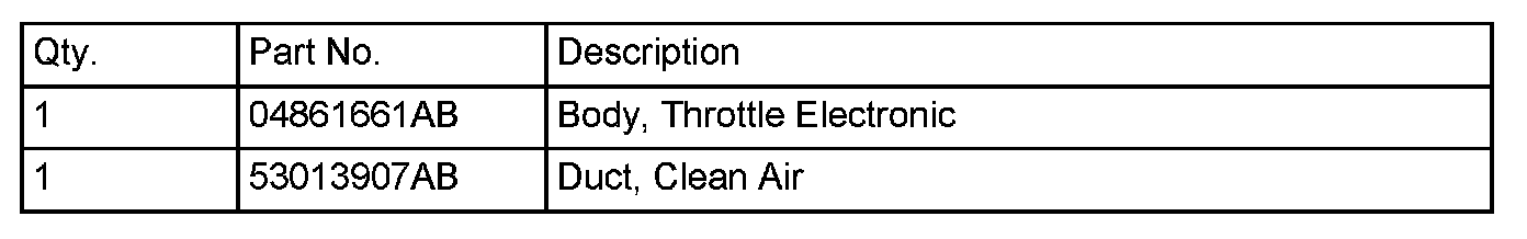 1. Replace the throttle body with p/n 04861661AB and clean air duct with p/n 53013907AB. Follow the detailed service procedures available in DealerCONNECT/TechCONNECT, Refer To Group 14 - Fuel Systems > Fuel Injection - Gas > Throttle Body Removal and Installation Procedures.