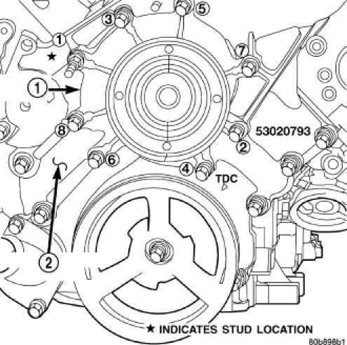 Tighten the oil pump and primary timing chain tensioner retaining bolts to 28 Nm (250 in. lbs.) in the sequence shown.