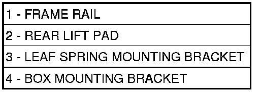 NOTE: The rear lifting pads should be wedged between the forward flange of the leaf spring bracket and the frame rail. Safety stands should be placed under the frame rails at the front and rear ends.