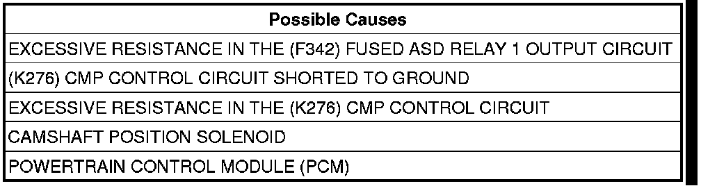 Using a 12-volt test light connected to ground, check the (F342) Fused ASD Relay 1 Output circuit in the Camshaft Position Solenoid harness connector.
