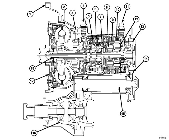 The 40TE is a four-speed transaxle that is a conventional hydraulic/mechanical assembly with an integral differential, and is controlled with adaptive electronic controls and monitors. The hydraulic system of the transaxle consists of the transaxle fluid, fluid passages, hydraulic valves, and various line pressure control components. An input clutch assembly which houses the underdrive, overdrive, and reverse clutches is used. It also utilizes separate holding clutches: 2nd/4th gear and Low/Reverse. The primary mechanical components of the transaxle consist of the following: